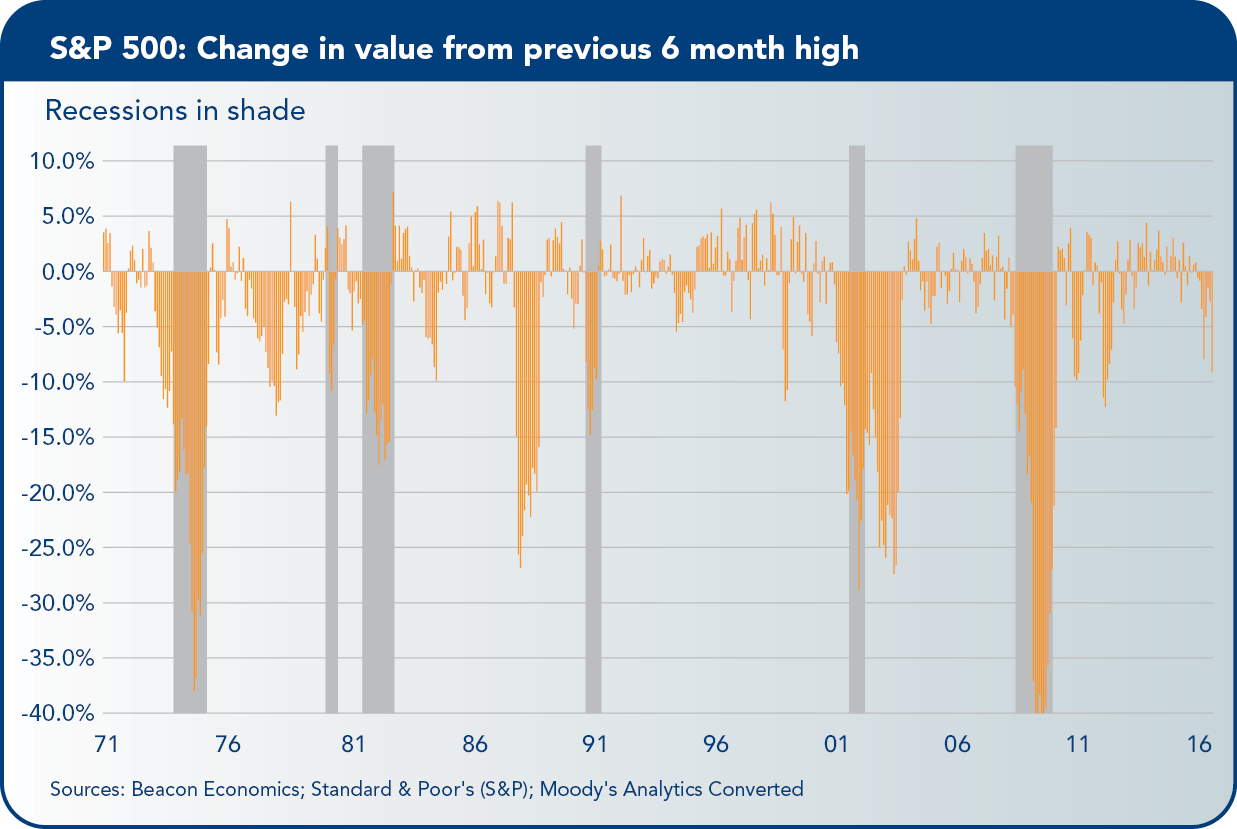 But the idea that the markets are forward looking couldn’t be farther from the truth. The chart above shows the history of stock market selloffs, as measured by the difference in the current value of the market relative to the high of the previous 12 months.