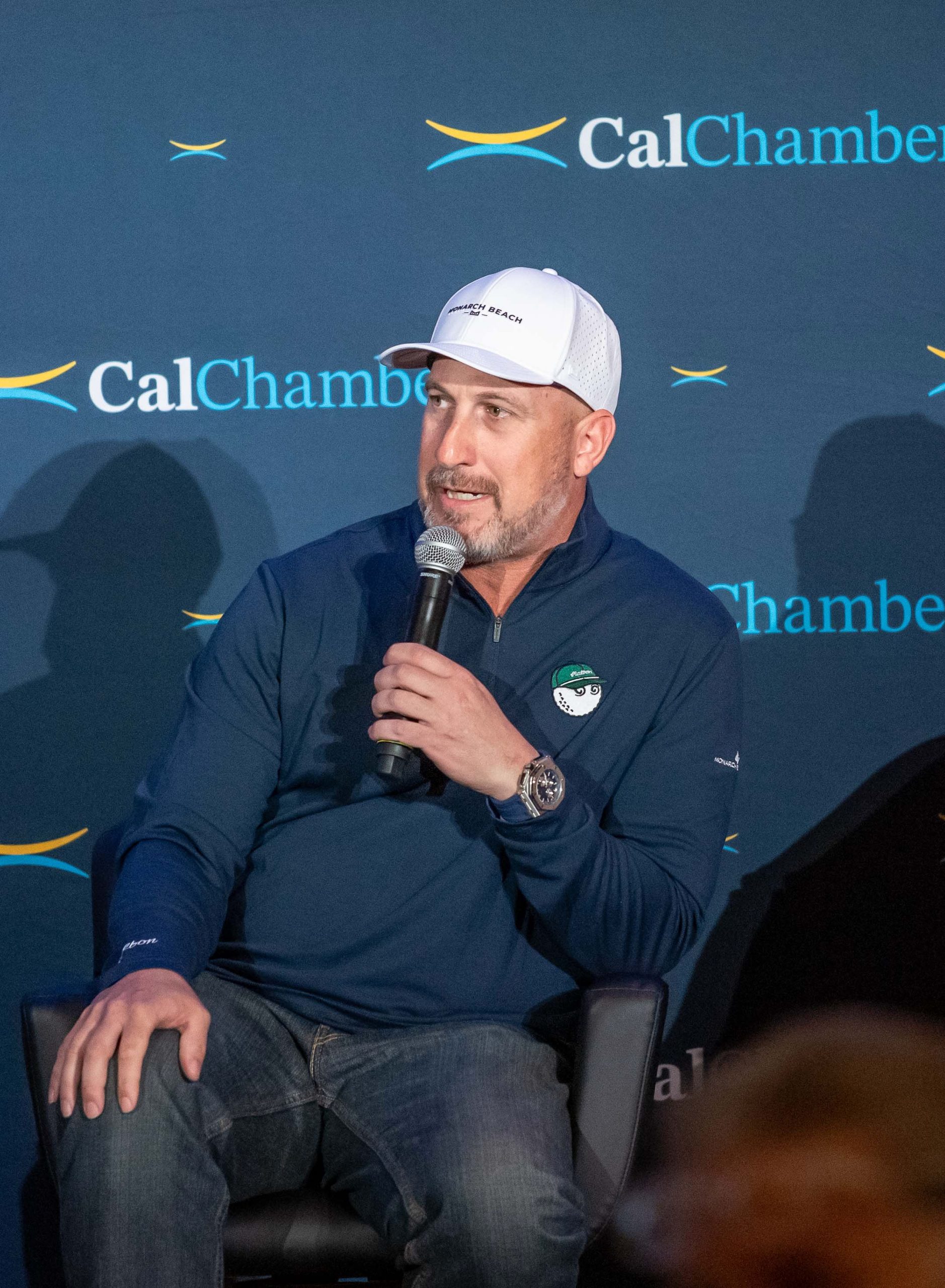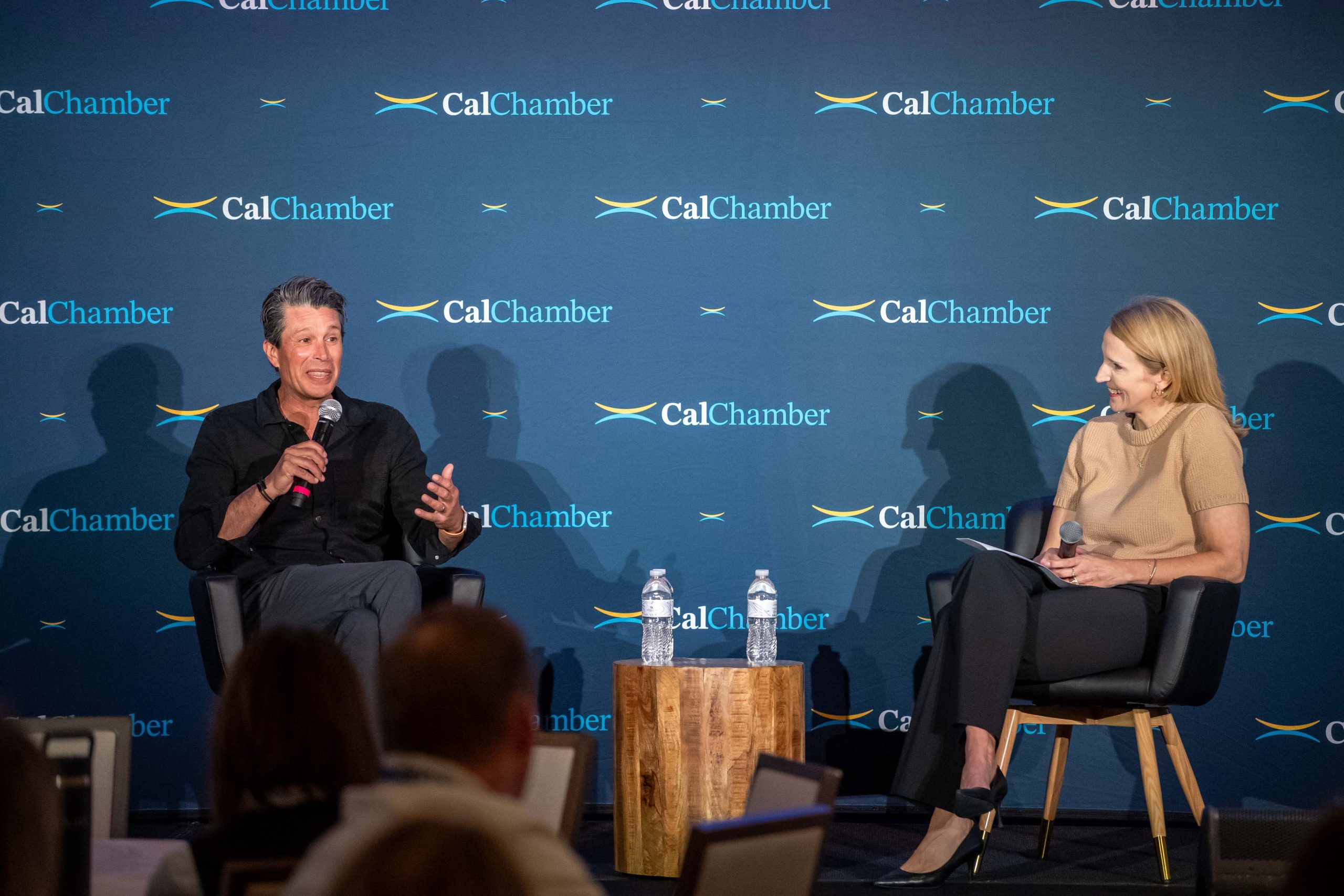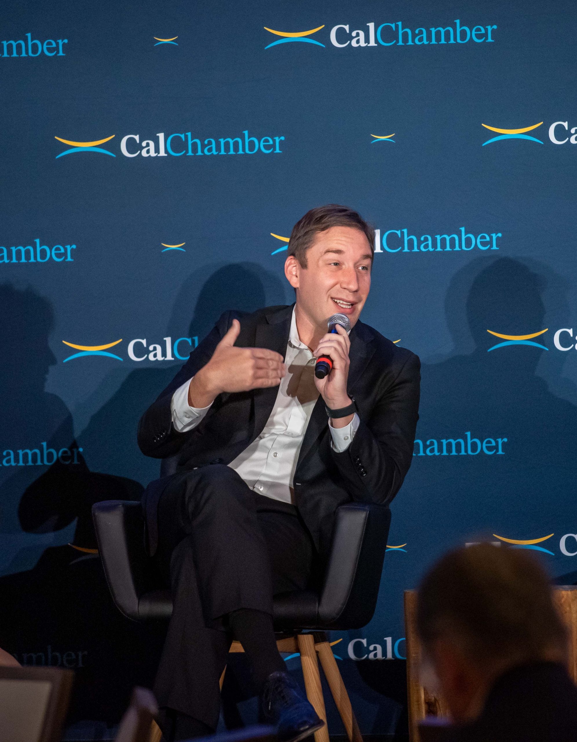 Nathan Barankin, chief of staff to Governor Gavin Newsom, shares an anecdote from his time in the Governor’s office with CalChamber President and CEO Jennifer Barrera and the Public Affairs Conference audience in the final session on October 30.