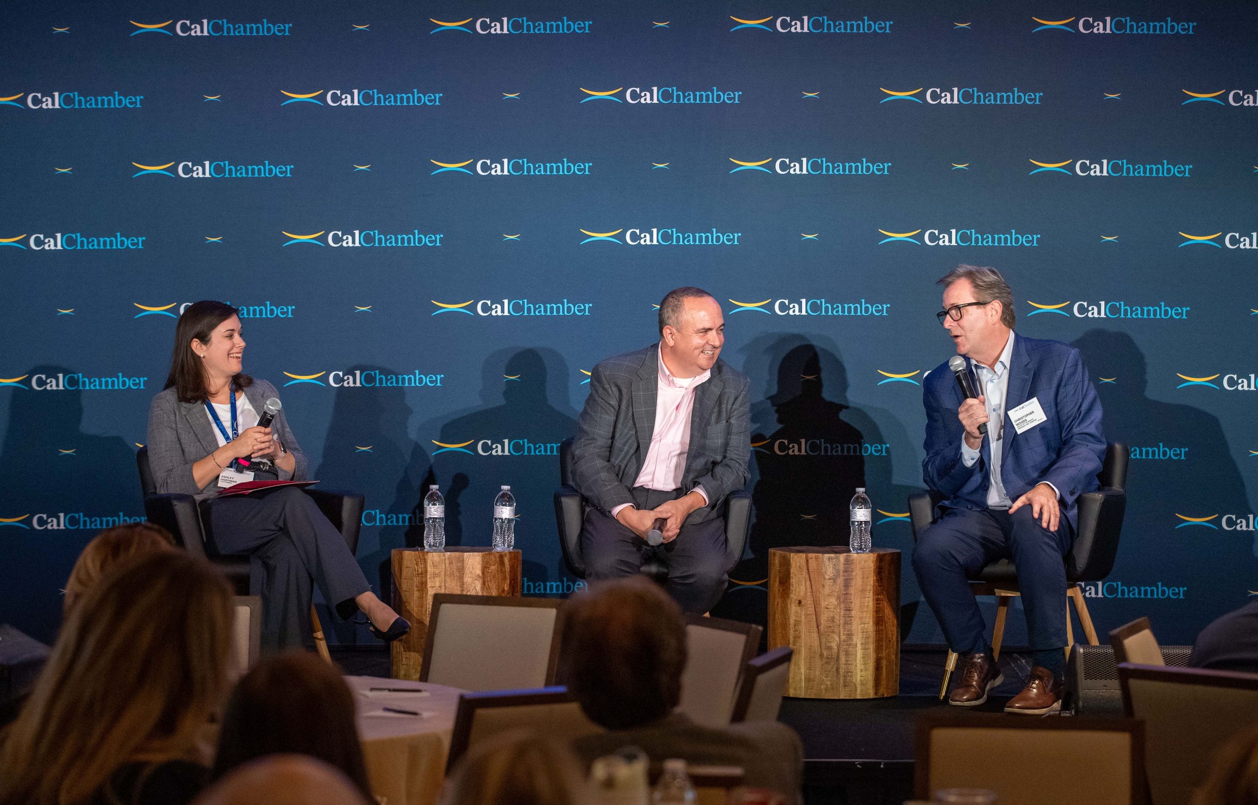 Ashley Hoffman, CalChamber vice president and deputy chief of staff for advocacy, moderates an overview of the California budget with Jason Sisney, budget advisor to Assembly Speaker Robert Rivas and the Assembly Democratic Caucus, and Christopher Woods, budget director for the Office of the Senate president pro tempore.