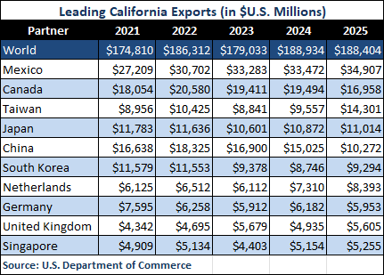 - Goods exports from California to Mexico increased from $33.47 billion in 2024 to $34.91 billion in 2025, maintaining the country’s spot as California’s top export partner.